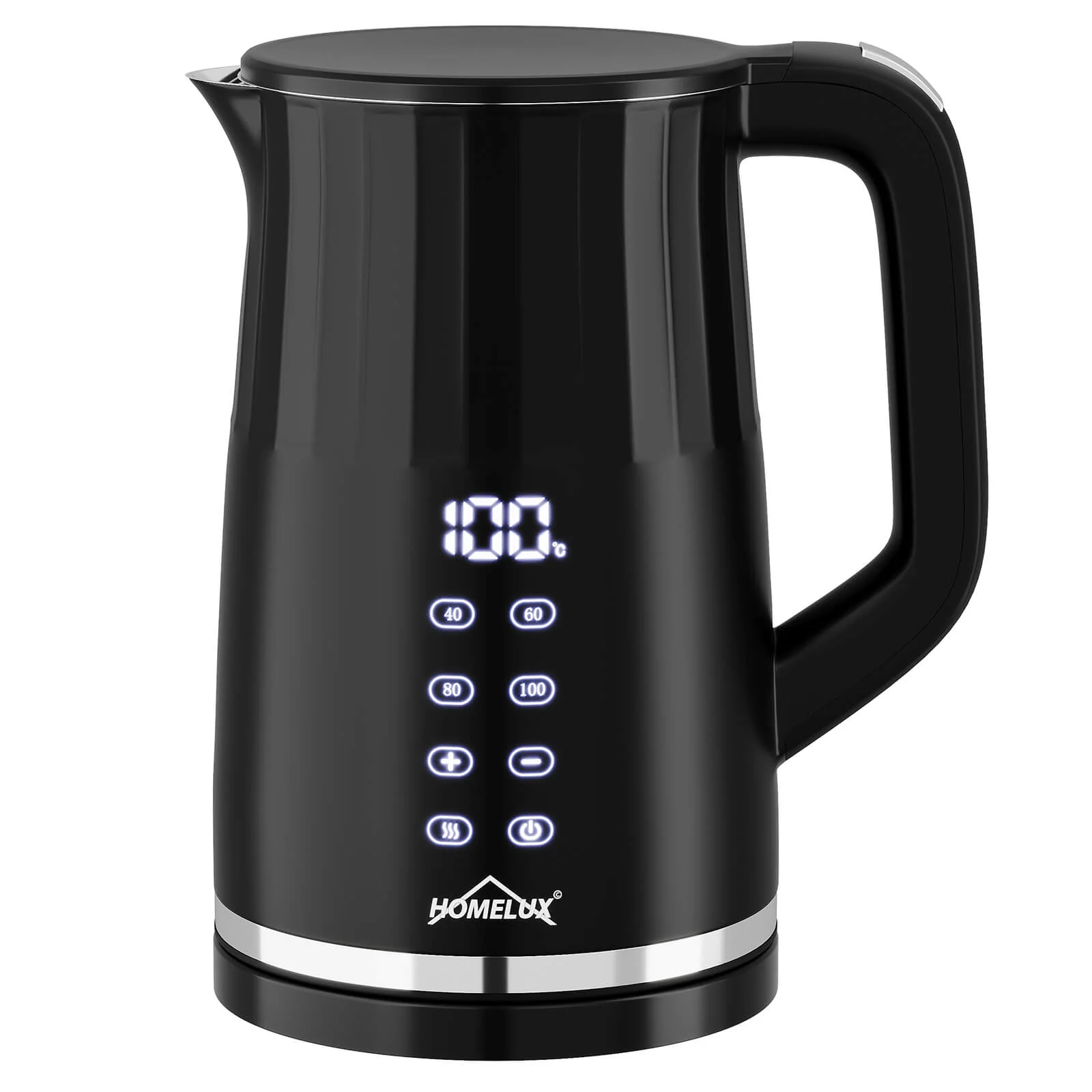 Der Homelux 2200W Elektrische Wasserkocher bietet eine präzise Temperaturwahl im Bereich von 40°C bis 100°C in 5°C-Schritten, sodass Sie die ideale Temperatur für jedes Getränk exakt einstellen können. Das große digitale LED-Display zeigt stets die aktuelle Wassertemperatur an, sodass Sie jederzeit wissen, wann das Wasser die perfekte Temperatur erreicht hat. Vier voreingestellte Temperaturstufen (70°, 80°, 90° und 100°C) ermöglichen schnellen Zugriff auf häufig benötigte Temperaturen.