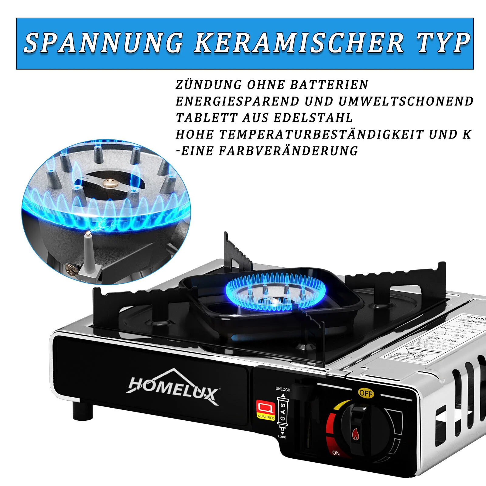 - Zündung: Automatische Piezo-Zündung (elektrisch)