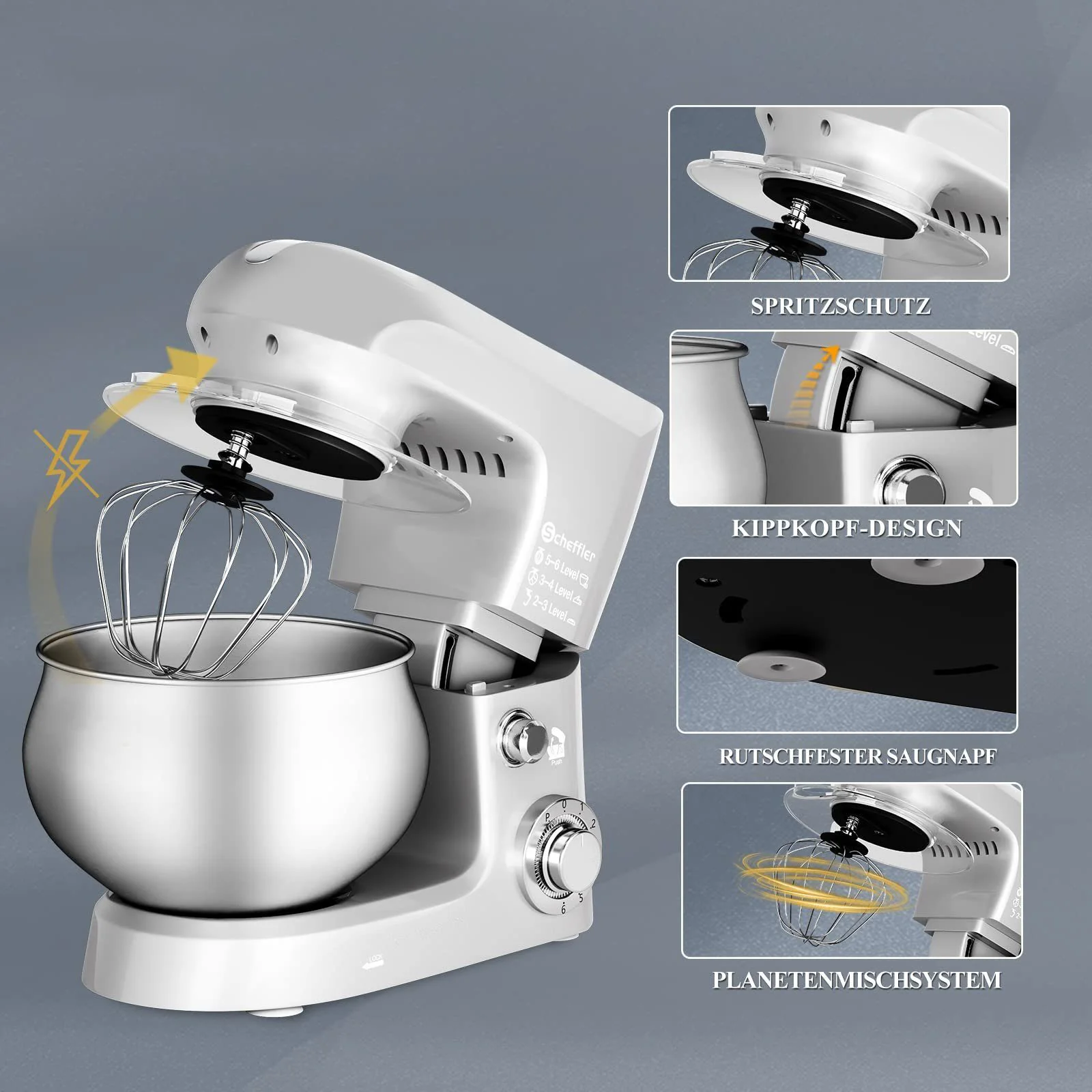 Dank der rutschfesten Silikon-Saugfüße bleibt der Mixer während des Betriebs stabil und verhindert, dass er verrutscht oder wackelt. Eine Schutzabdeckung mit Ausgießöffnung hilft, die Zutaten einfach hinzuzufügen, ohne dass sie in der Küche verschüttet werden. Der Tilt-Head-Mechanismus ermöglicht es, den Kopf mit nur einem Knopfdruck anzuheben, um die Schüssel oder das Zubehör problemlos zu wechseln. -