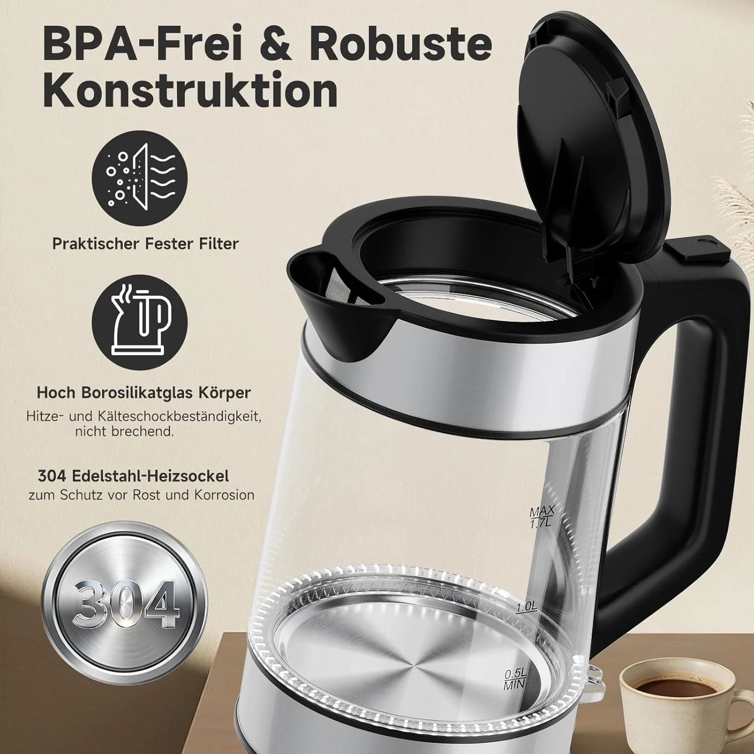 Materialien: Hitzebeständiges Borosilikatglas, 304 Edelstahl, BPA-freier Kunststoff