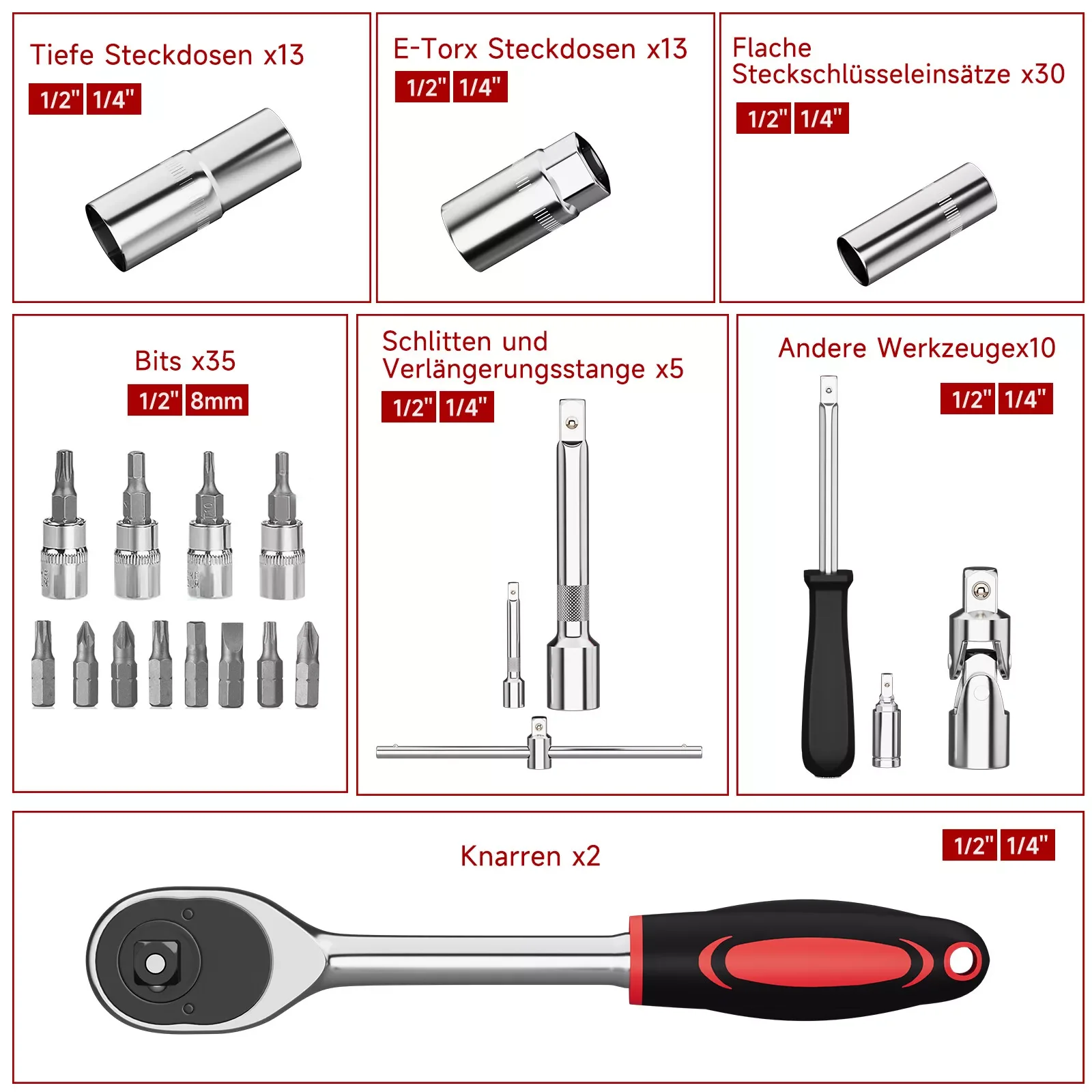- Tiefe Steckdosen: 13 Stück (1/2" und 1/4")