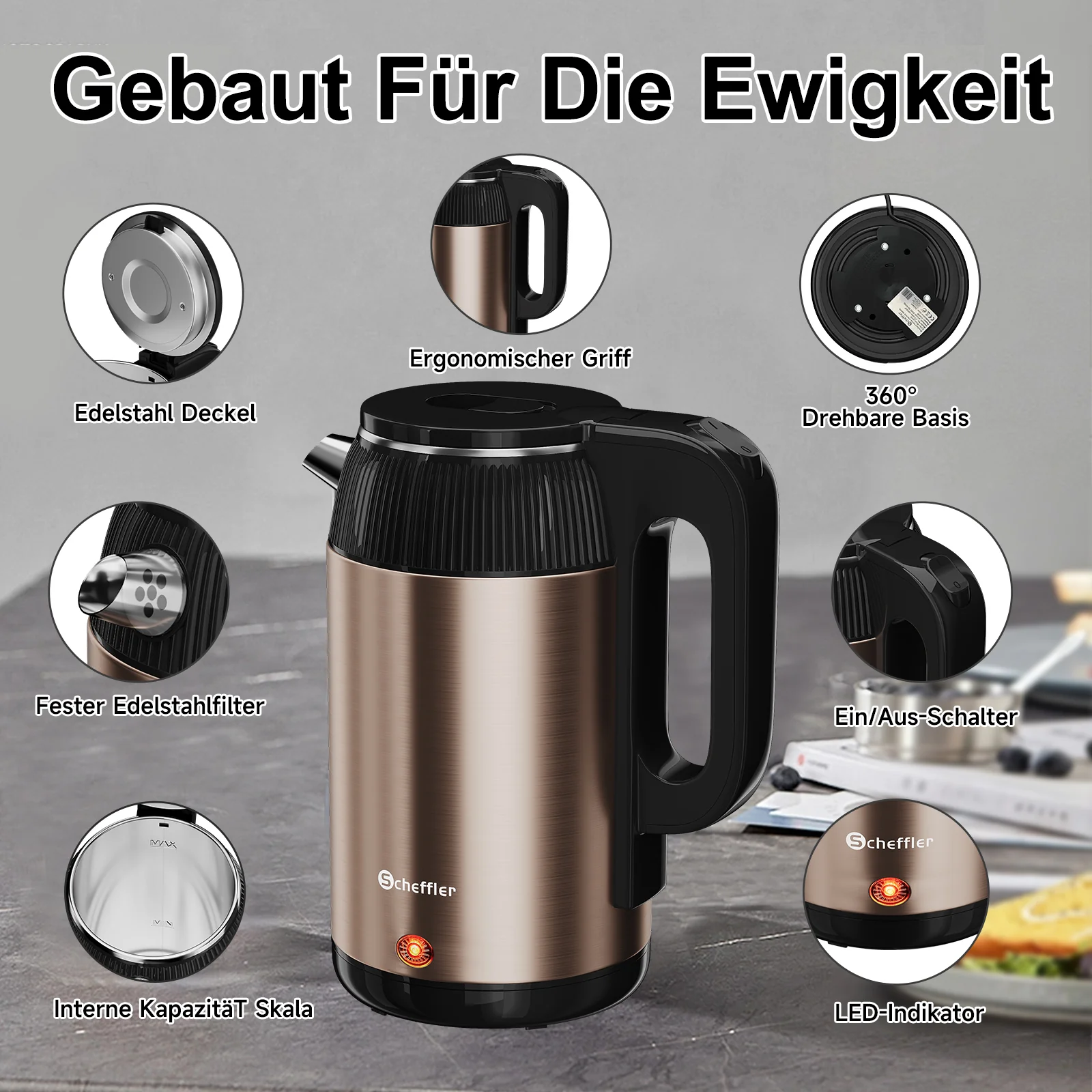 Benutzerfreundliches Design: Mit festem Filterloch, 360° schwenkbarem Sockel, rutschfestem Griff und Sichtfenster für den Wasserstand ist dieser Wasserkocher besonders einfach zu bedienen.