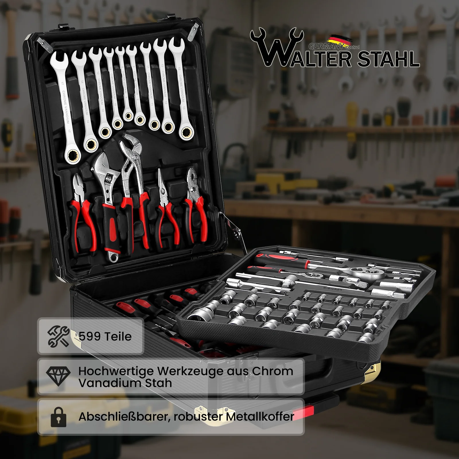 Werkzeugkoffer 599-tlg, Aluminiumkoffer, vielseitiges Werkzeugset für Werkstatt & Haushalt